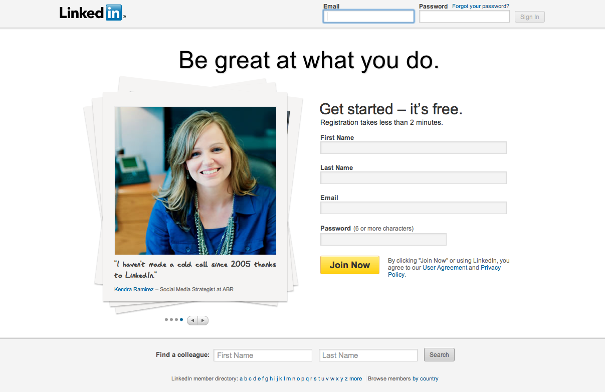A collection of starting pages for web based services. I am collecting these to see how well or how poorly the page explains what the service is, who it is for, and how to proceed. The frontpage a quite a challenge in most cases since it will typically try to compel the user to surrender personal information before proceeding. Not only this, but a frontpage for a new service must also educate the user as to what the service is, and why one should bother at all. Looking at the average frontpage certain design patterns emerge. There is the 1-2-3 steps page, the watch this short video tactic, the let’s get started – give us your email strategy. What did you think when you first saw facebook? linked in? What made you get your twitter account set up? And in case you are wondering, I am trying out the Tell me i’d love to hear strategy.
