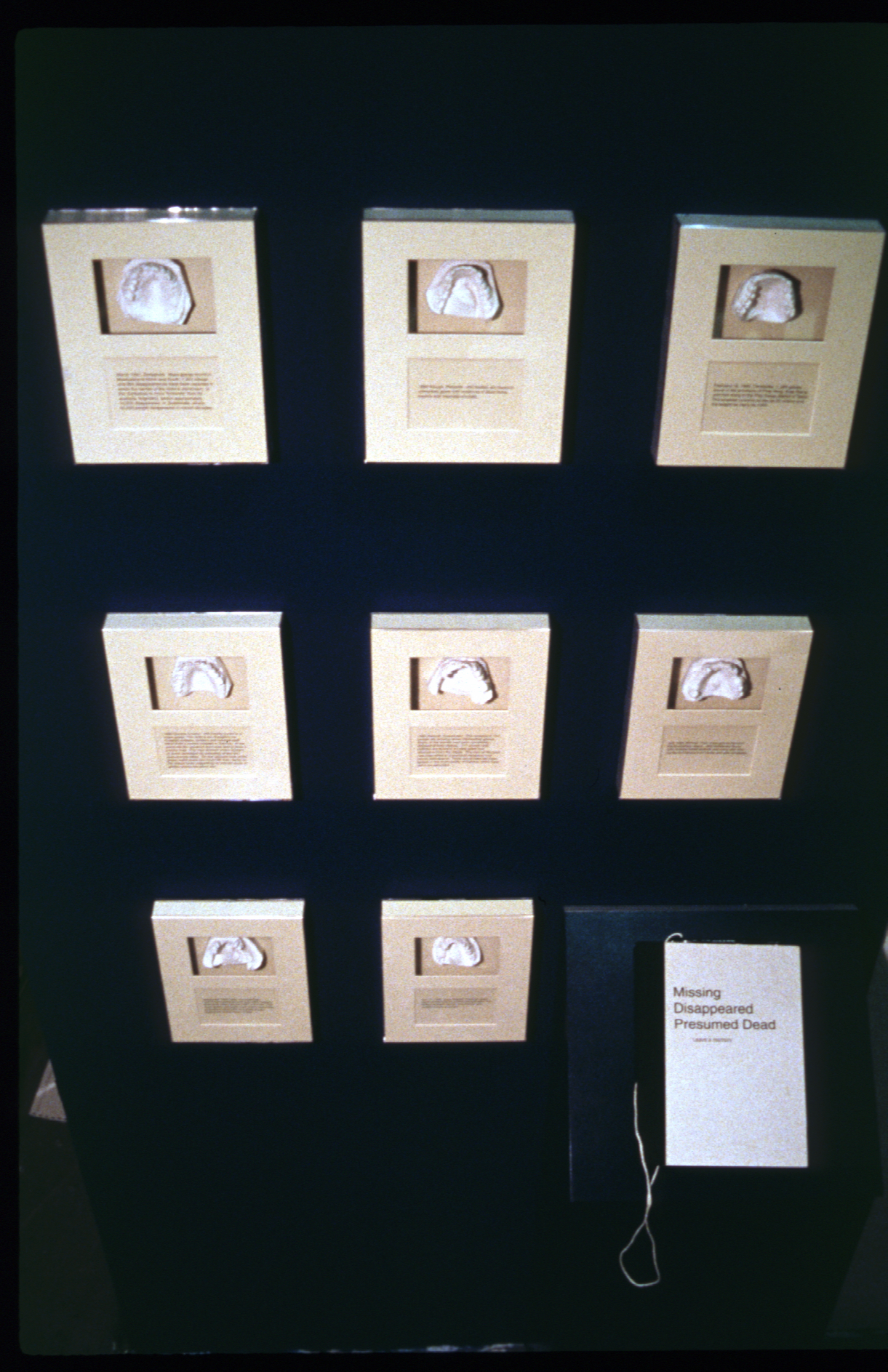 Dozens of plaster dental casts are displayed on a wall, conjuring up the forensic method of identifying bodies based on dental records. Each dental record features a small piece of text describing occasions in which people were disappeared by authoritarian governments.